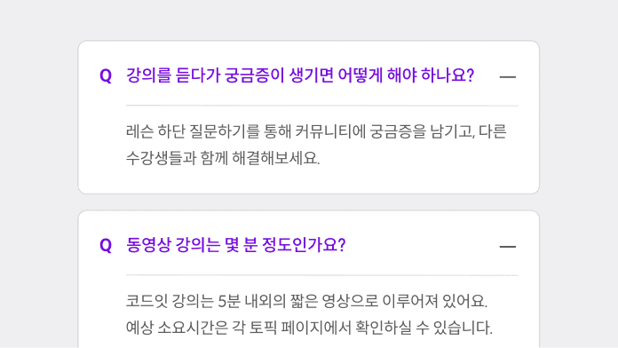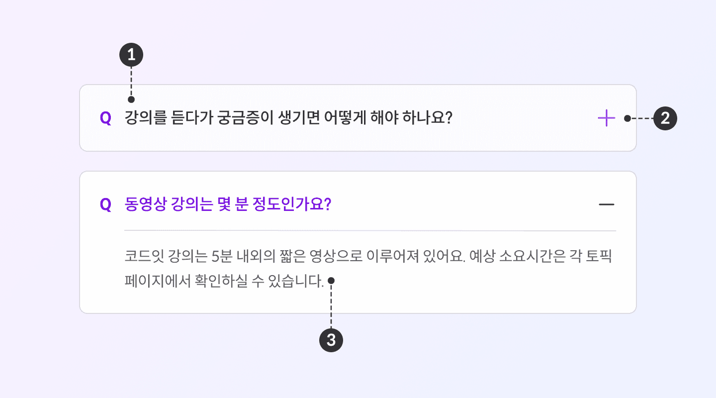 질문 또는 콘텐츠를 요약한 문장으로 이루어진 텍스트입니다. 펼친 상태일 경우 타이틀에 txt-purple-primary 컬러를 사용합니다.