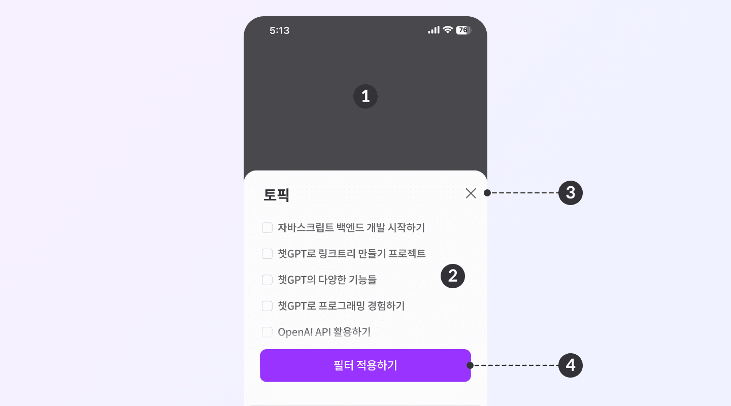 반투명 배경으로, 사용자가 바텀시트 외부를 터치했을 때 닫히도록 동작합니다.