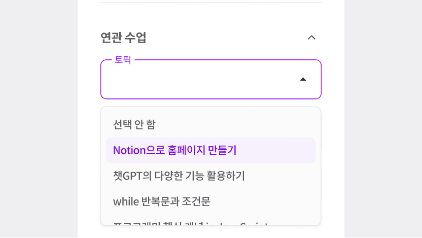 옵션 목록의 확장 여부를 나타내는 아이콘입니다. 열림/닫힘 상태가 시각적으로 구분되어야 하기 때문에 하단 방향 화살표(▼) 아이콘을 사용하며, 사용자가 클릭 가능 영역을 직관적으로 인식하도록 돕습니다.