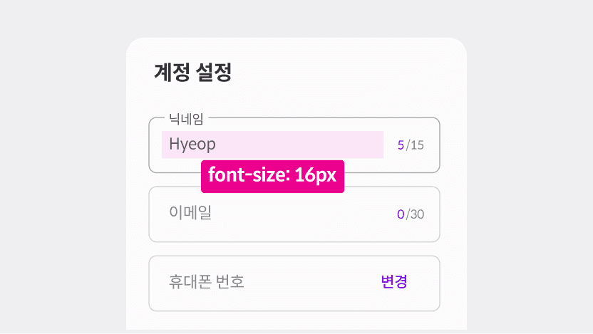 사용자가 텍스트를 입력하는 기본 입력 영역입니다. 포커스, 비활성, 오류 등 상태에 따라 시각적 변화 상태를 제공해야 합니다.